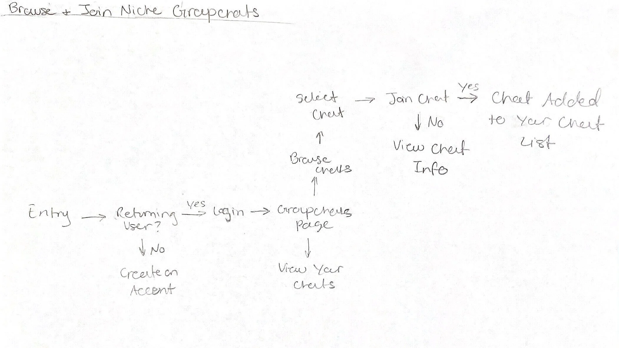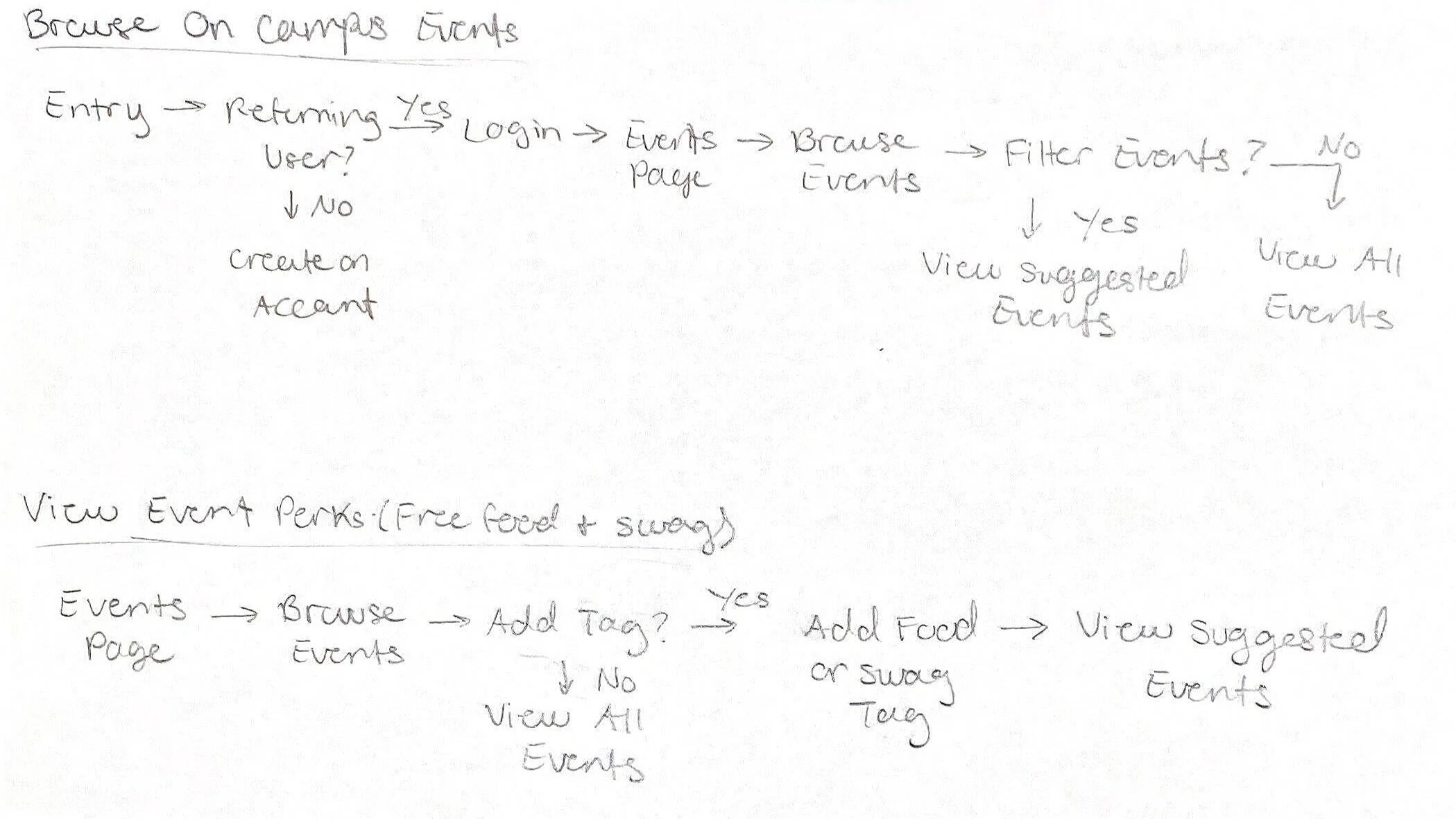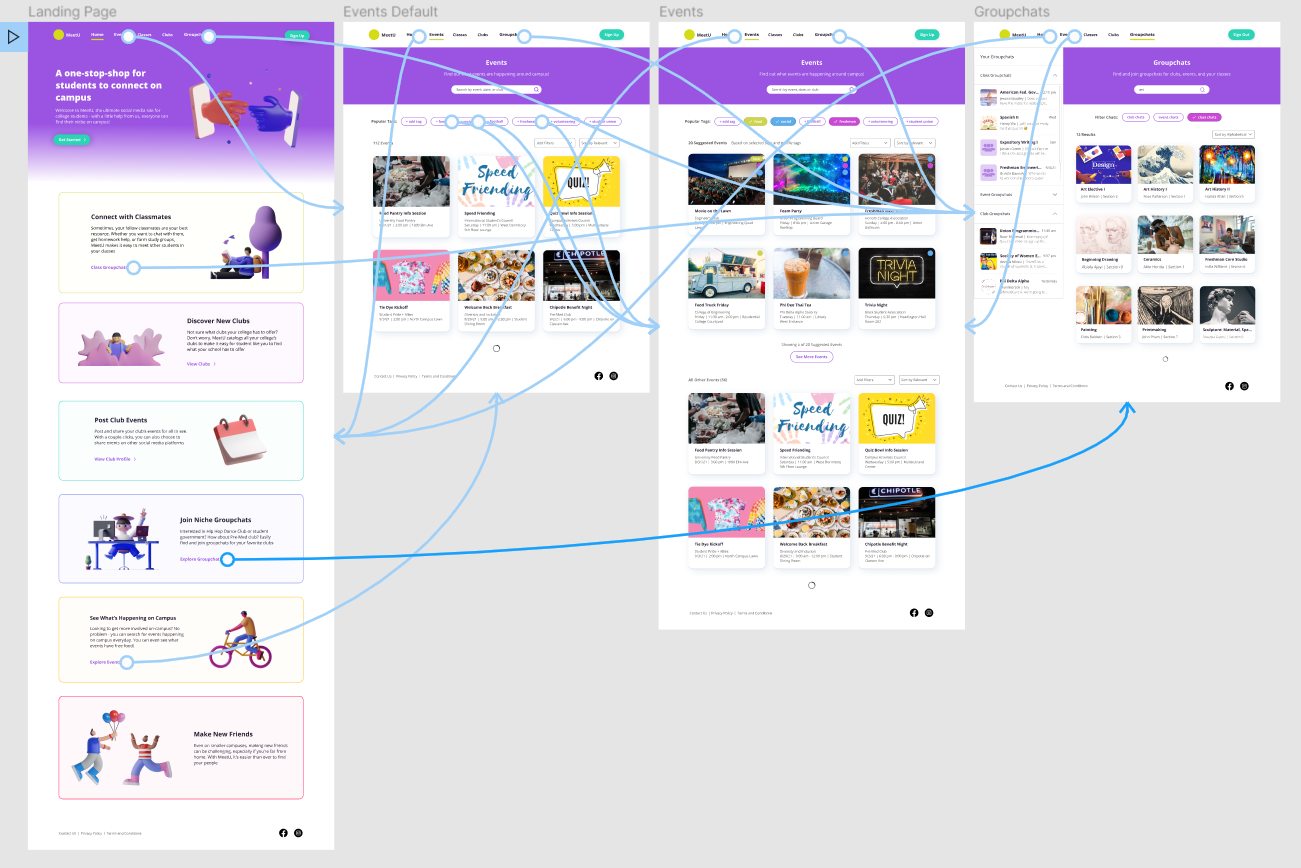 With these user stories in mind, I considered how users might navigate through the pages of the website to accomplish these tasks. I thought about how individuals like Gloria would go about browsing and viewing the events their club posted. Or what it would look like if Jai wanted to browse through group chats and join one for a class. And for users like Andrea, I wanted to develop a flow that would allow them to see event details and perks, like free food.
