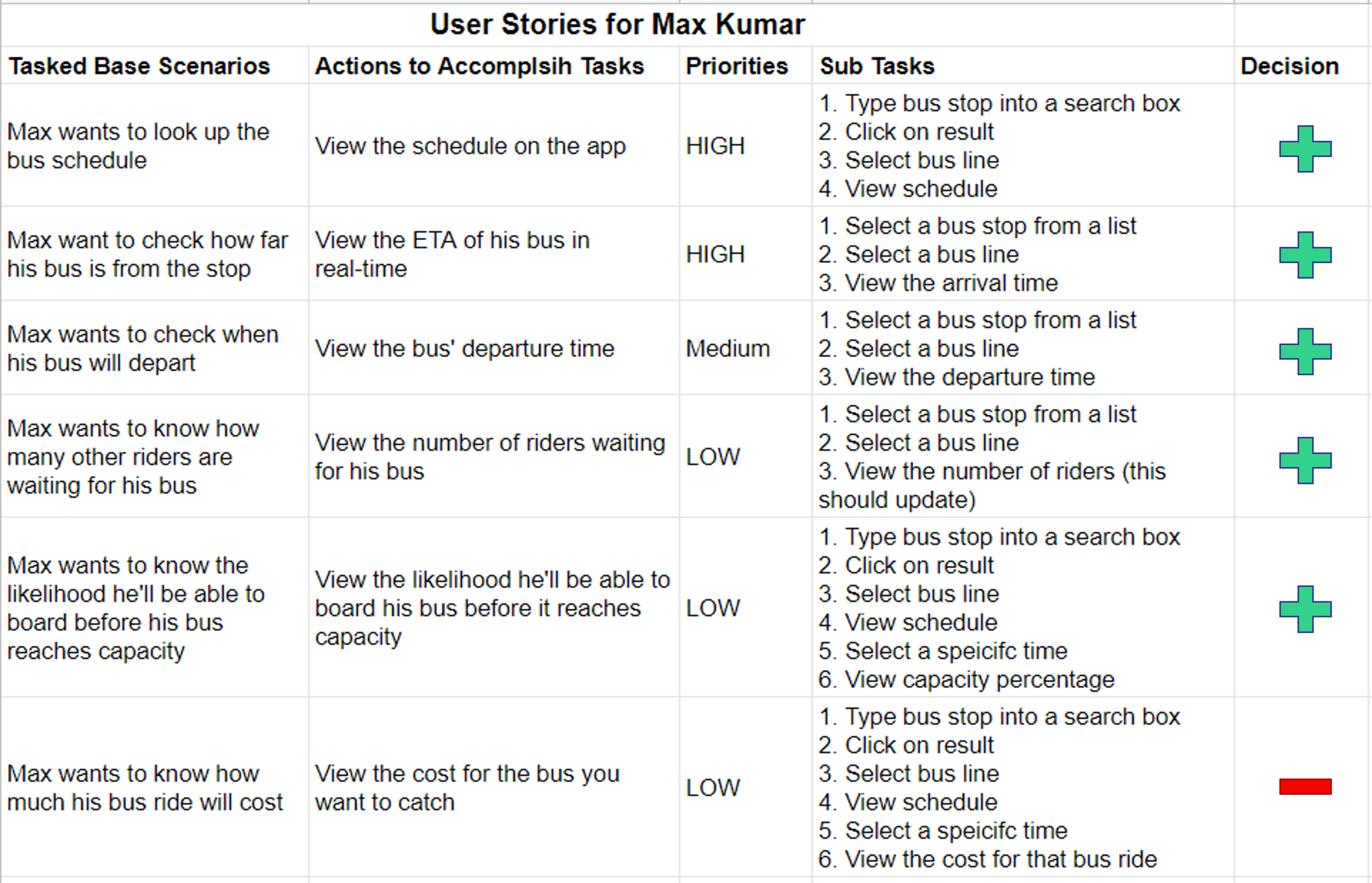Next, I wrote 7 user stories with scenarios in which users would find the product useful and the types of tasks they would seek to accomplish. I prioritized the user stories that aligned closest with the original concept I had for the website (finding events and joining niche group chats to communicate with and meet other students). The plus signs indicate which stories I wanted to reference as I developed a wireframe and the minus signs are the stories I chose to revisit for future iterations of the product.