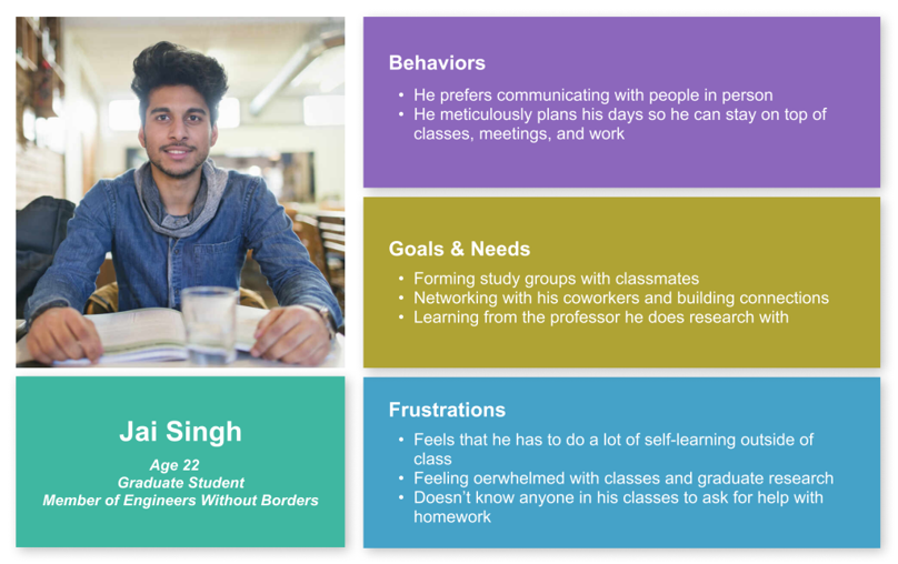 I recruited 4 survey respondents for user interviews to gain a deeper insight into the behaviors, needs, and user pain points of my target audience. I developed a session guide, interview script, interview questions, and consent form. From these interviews, I created 3 fictional characters that represent the types of users who would find MeetU useful.