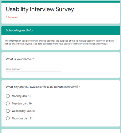 To recruit participants for usability testing, I created a user survey and sent it to friends and family members. The survey consisted of demographics and scheduling questions. Due to a variety of constraints, it was challenging to gather participants to take the survey who were also willing to participate in testing, but I was able to find 5 people to complete usability interviews. Of the five participants who took the survey: